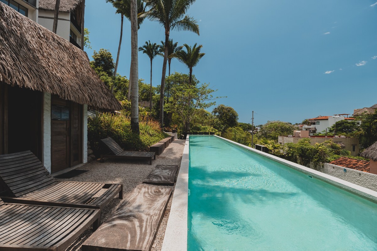 Gloednieuw Studio-appartement in Casa Infinito, Sayulita. Inclusief een verwarmd privézwembad en een oneindig uitzicht op de oceaan. Kingsize bed met kussens, snelle wifi en kitchenette. Het mini-privézwembad is verwarmd. Geniet van wifi via Sayulitawifi om vanuit huis te werken, smart-tv en een gezellig bed met kussens. Dit is het perfecte romantische uitje voor een stel in een gloednieuw complex met uitzicht op de oceaan op slechts een minuut rijden van het strand. Gemeenschappelijke ruimtes zijn onder andere een fitnessruimte met uitzicht en een yogadek met dagelijks beschikbare lessen