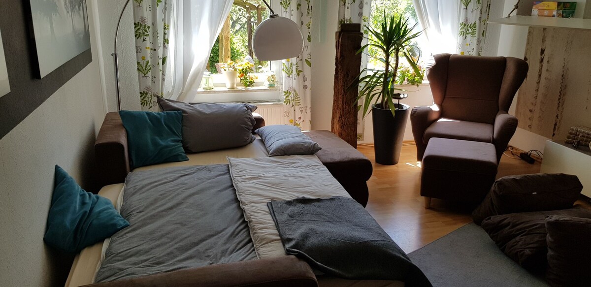 Zoet, gezellig 1-kamer appartement tussen Hannover & Hildesheim met aparte ingang, keuken en doucheruimte. 1 eenpersoonsbed en een comfortabele slaapbank. 5 minuten naar de tram naar Hannover, super goede bus- en treinverbinding naar Hildesheim + Hannover. 10 minuten met de auto naar het Hannover Exhibition Centre/Expopark. Prachtig zonneterras dat uitnodigt tot luieren en een grote tuin. Op verzoek kan een aangrenzende 2e kamer worden gehuurd met een eenpersoonsbed en een slaapbank, die toegang heeft tot het terras