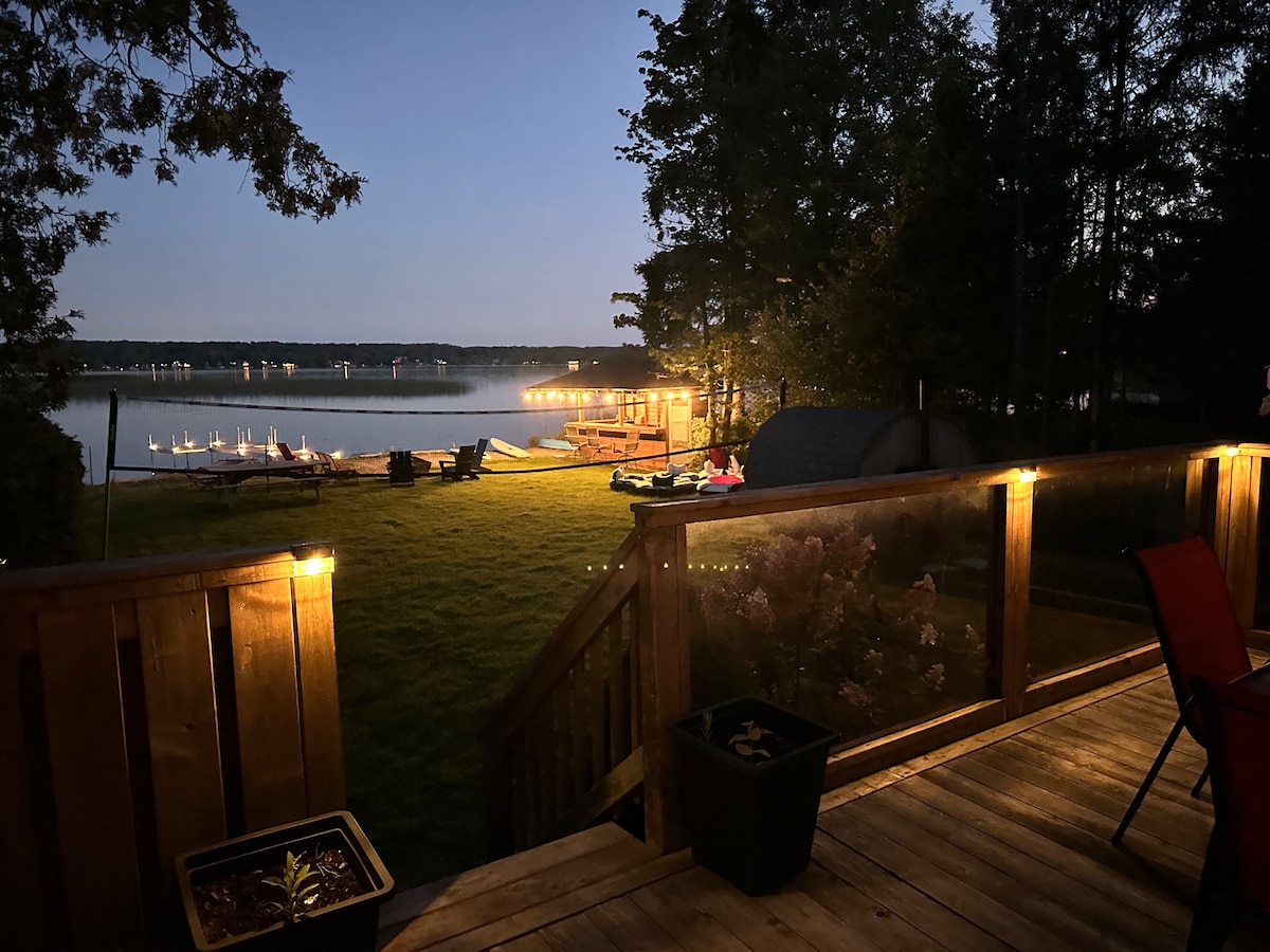 Onze hut met twee slaapkamers + cubby (beschikbaar in de zomer) bij een schilderachtige vijver is een privé-uitje in de buurt van de hoofdweg en vele voorzieningen. Eigen buitenruimte met bubbelbad, terras, vuurplaats en wandelpaden. We hebben een schuur met ping pong en tafelvoetbal. We zijn 20 minuten naar Barrie, 10 minuten naar Midland, 20 minuten naar het strand van Balm, Wasaga-strand, Mt. St. Louis and Horseshoe Valley resort.