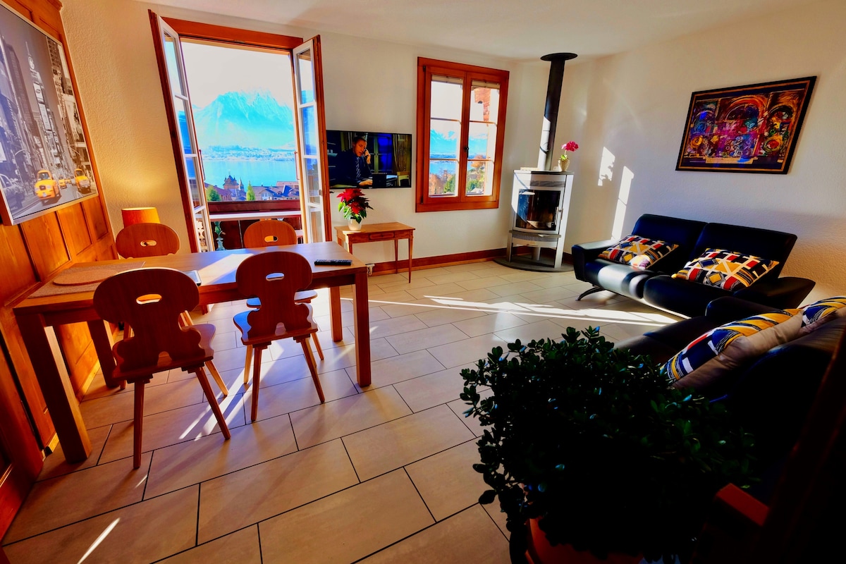 Kom en maak wat herinneringen in onze unieke, ruime en gezinsvriendelijke woning. Gelegen op 8 minuten boven Montreux, zijn we vredig genesteld tussen een groot groen veld en een kleine wijngaard. Word wakker met een prachtig uitzicht op Lac Leman en de Grammont-top en pak je ochtendkoffie of een glas wijn op het dakterras:) We zijn gemakkelijk bereikbaar omdat het treinstation Planchamp op slechts 1 minuut loopafstand van de voordeur ligt en we 1 gratis parkeerplaats hebben. Zoveel avonturen om beleefd te worden:)