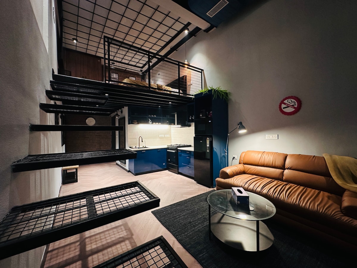 Discover our elegant two-story loft in Dehradun! Featuring a cozy bedroom & sofa bed, free Wi-Fi, AC, TV, and 2 private bathrooms. Work comfortably at a dedicated workstation in a space with high ceilings, large windows, a private balcony, and terrace. Experience a fully equipped kitchen paired with an inviting and innovative loft net, along with essential comforts such as a First Aid Kit, fire extinguisher, free parking, seamless self-check-in, board games, hair dryer, iron and a baby chair.