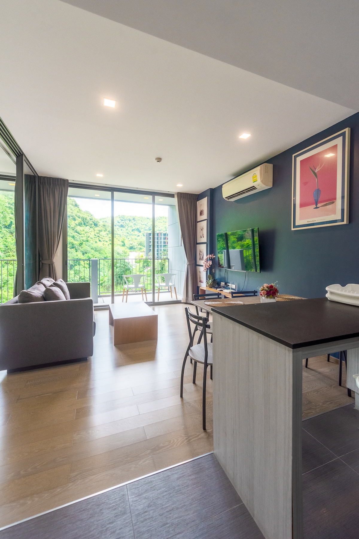 Zelf inchecken. Droom wonen tijdens je vakantieverblijf in The Sunshine Khaoyai met een panoramisch uitzicht vanaf mijn balkon op de hoge verdieping. Je wordt omringd door golvende heuvels en uitgestrekte bomen met een rustige sfeer. Het appartement is afgelegen en aan een rustige en rustige kant van het gebouw. Comfortabel bed, goede waterdruk, snel internet. Je kunt genieten van alle faciliteiten, zoals een zwembad, fitnessruimte, open lobby, EscapeYard park, Green Oak bistro en daktuin.