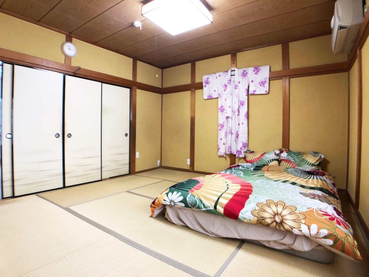 Probeer de Japanse cultuur! Ervaar de Japanse traditionele cultuur. Je kunt een kimono dragen en Japanse dans ervaren.Draag een yukata en bon dance.Shamisen spelen of shamisen spelen.Je kunt ook kalligrafie en theeceremonie ervaren. Laten we met je koken.Osaka 's takoyaki en okonomiyaki.Authentieke Japanse keuken. We willen zoveel mogelijk gastvrijheid bieden aan buitenlanders die naar Japan zijn gekomen.Voel je thuis in ons unieke en rustige huis. Ik heb een bureau en een stoel en een printer voor je computer als je erover denkt om op afstand te werken. Wifi is Soft Bank Light 10 Giga Dichtstbijzijnde station is JR Tennoji. Vanuit Shin-Osaka stap je uit bij Tennoji met de metro Midosuji Line, ga je naar het busstation met stadsbus, stap je uit bij Iwakoen-mae en loop je 2 minuten. 1 halte op de Yamatoji-lijn vanaf JR Tennoji, op 10 minuten lopen van station Higashibe Ichibe-mae. Ik haal je met de auto op bij Tennoji Station of Higashibe Market Station.