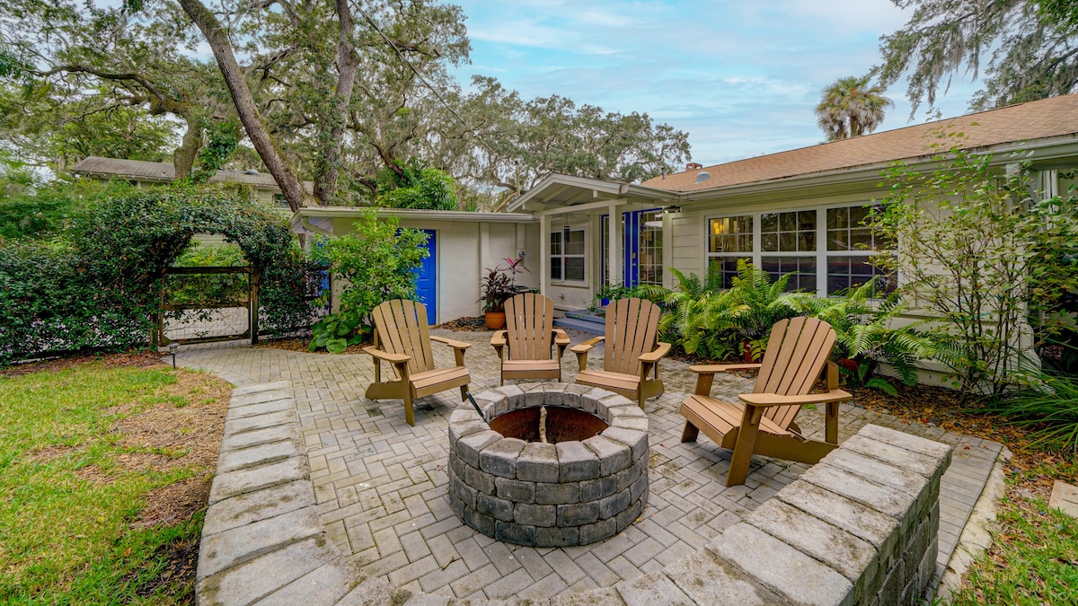 In St Augustine's historic neighborhood. Completely modernized, but we kept the old charm. New everything. Included amenities bikes, BBQ, Fire pit, outdoor lounge furniture, private patio, laundry inside, Nespresso maker, coffee included, soaps and shampoos, beach essentials. Everything you need is here. Just bring your suit case. 5-10 minute walk to the center of town. Catch the trolly at the end of the street. Buy your tickets here and receive a discount. Welcome to a fun memorable stay.