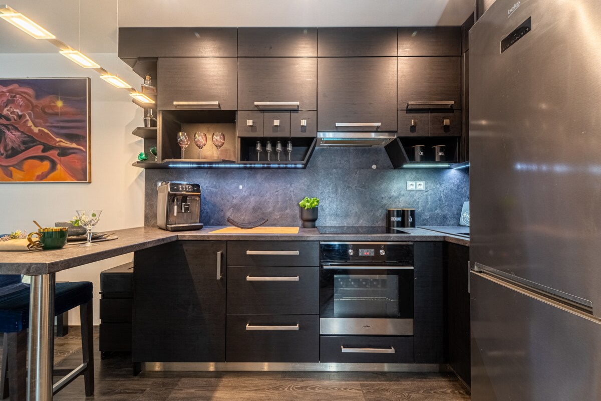 Elegant gezellig appartement in het centrum. Het appartement ligt aan de rivier op weg naar het dok, niet ver van het zwembad, de mogelijkheid om door het park te lopen op de schouder van Moravië. Het appartement ligt in een rustig deel, met een tuin met uitzicht op de zonsopgang. De tuin is romantisch verlicht met een zithoek onder een pergola, een vuurplaats en een grill. Perfect voor een stel met kinderen of personen op zakenreis. Slaapkamer met uitzicht op de tuin. Woonkamer met keuken en toegang tot tuin.
