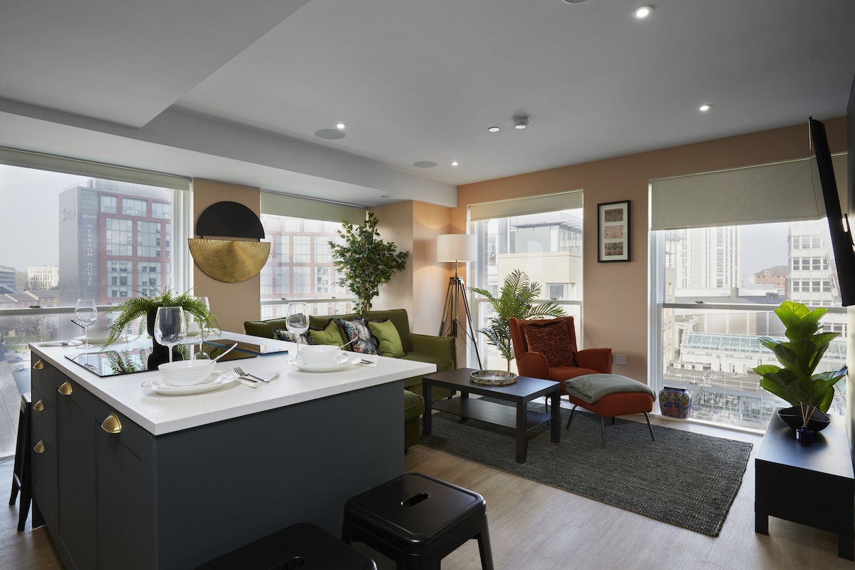 A boutique apartment set within an historic Grade II listed former bank in Leeds city centre. The apartment includes a state-of-the-art contemporary kitchen and dining area and an open plan living and entertainment area. The bedroom is generously sized and the bathroom has a modern spa-inspired feel with atmospheric lighting.