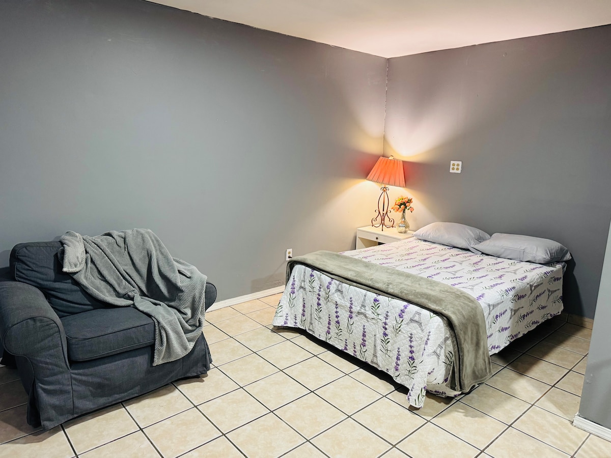 Welkom in onze charmante studio!! Zeer gezellige plek om te overnachten en te ontspannen in het queensize bed met luxe beddengoed (slechts één bed in studio). 55 inch smart-tv en gratis wifi inbegrepen. Beveiligingscamera's rond het terrein om je veilig te houden. Kleine keuken met alle voorzieningen inbegrepen, koelkast, koffiepot, broodrooster, magnetron en elektrische grill om te koken. Kleine eettafel en zithoek. Complete badkamer met shampoo, conditioner, bodywash en handdoeken inbegrepen. Kleine plek, maar gezellig.