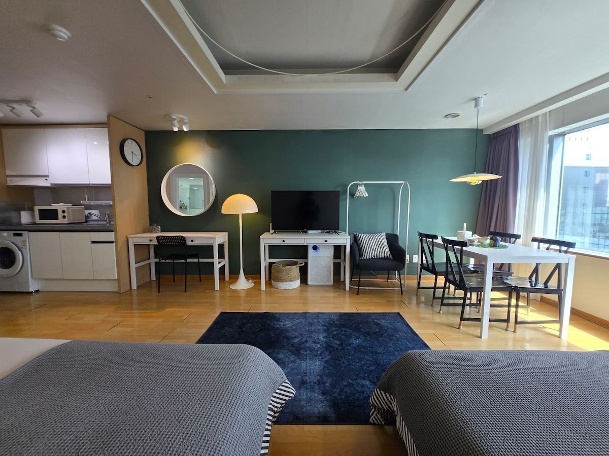 Op 5 minuten van afrit 6 van de Universiteit van Hongik. Het is een studio op de vierde verdieping van een oud gebouw zonder lift! Het is echter een gebouw gelegen op de hoofdweg, dus het is handig om te wonen en de accommodatie is rustig. Op de eerste verdieping van de accommodatie is er Olive Young en een heerlijk Koreaans restaurant. Lotteria en Mega Coffee liggen pal naast het gebouw. Mijn huis is het gelukkigst als er één persoon verblijft:) Je kunt jezelf bij z 'n tweeën thuis voelen. We doen ons uiterste best om ervoor te zorgen dat je een aangenaam verblijf hebt, dus rust comfortabel uit:)