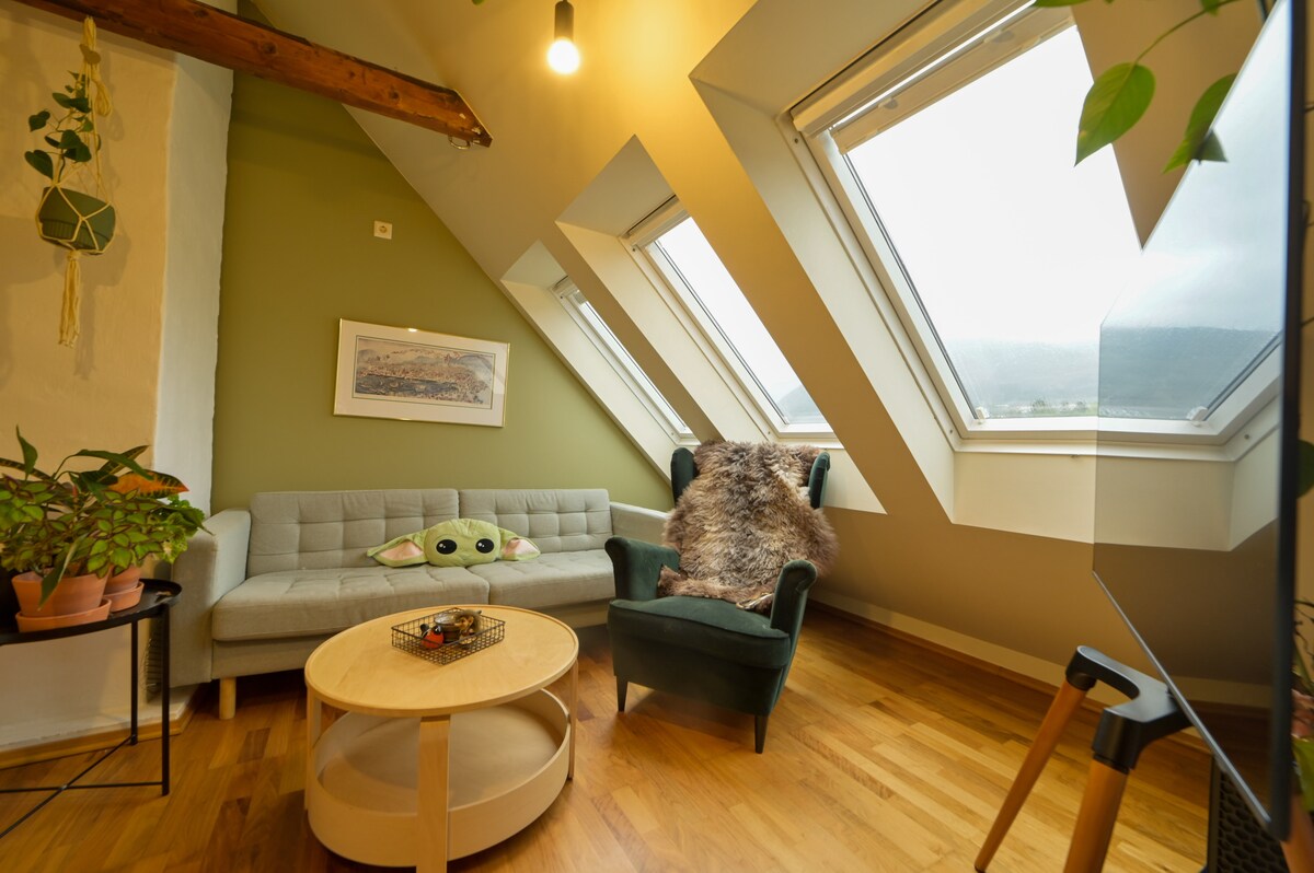 Gezellige en lichte loft met uitzicht op de stad – centraal Bergen