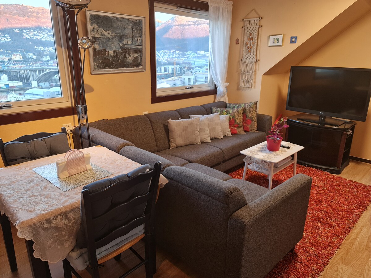 Licht, luchtig en gezellig, volledig opgeknapt. Gratis parkeren voor personenauto op de oprit naar het huis. Centraal gelegen, dichtbij stadsspoor en bus. Vlak bij Haukeland Hospital, Ulriken en Brann Stadium, het University College en de odonoloog. Handige winkel op 5 minuten lopen. Restaurants in de buurt en op loopafstand van het centrum, ongeveer 25 min.