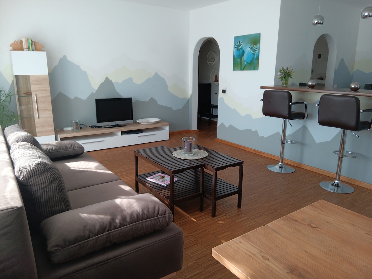 Het zolderappartement is een nieuw gebouw en heeft een goede thermische isolatie. De verbinding met het stadscentrum is te bereiken met verschillende buslijnen (gratis op zaterdag) of een wandeling van ongeveer 30 minuten. Winkelen (Aldi, Denn 's, Edeka, dm, bakker, slager, spaarbank, apotheek) liggen op loopafstand in een paar 100 m. Uitgebreide ontdekkingen in het veld en bos kunnen beginnen na een paar minuten lopen.