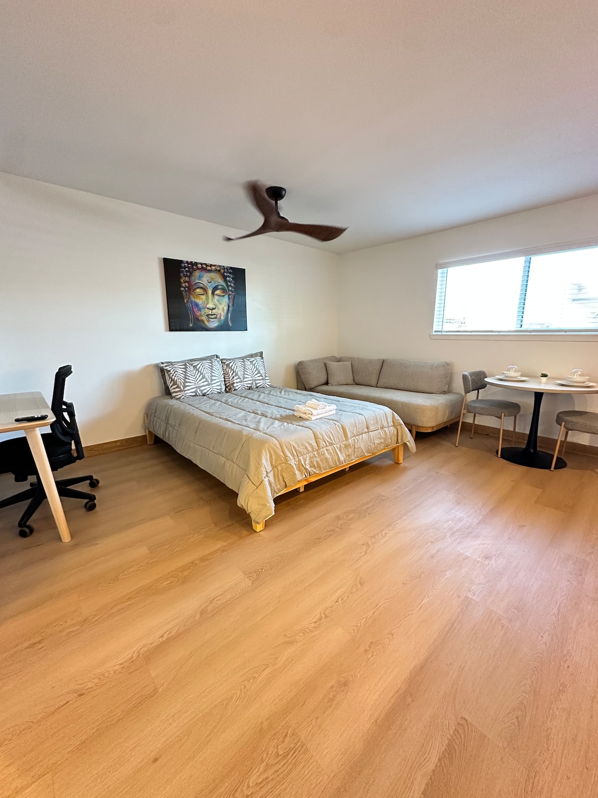 Rustige studio op de bovenste verdieping met uitzicht op de skyline op een toplocatie in het centrum. Licht, rustig en bewust ontworpen voor rust en ontspanning. Word wakker bij zonsopgang in het kingsize bed en kom tot rust in een rustige, verhoogde ruimte boven de stad. Bij meer dan 300 verblijven noemen gasten consequent het comfort, de netheid en hoe ontspannen ze zich hier voelen. Attente verhuur en een soepel, betrouwbaar verblijf. Beveiligde parkeerplaats inbegrepen, met gemakkelijke toegang tot het centrum en de Heights.