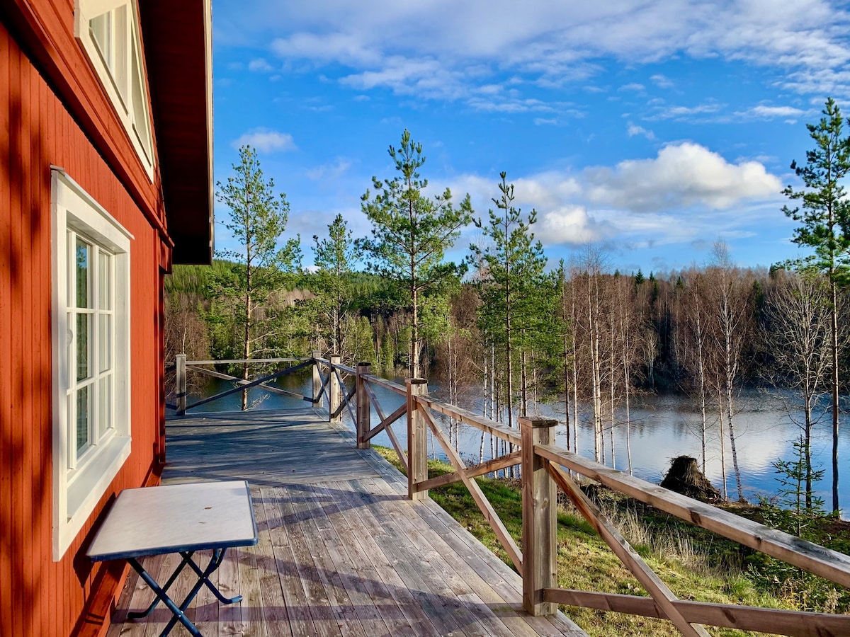 Een modern huis met een prachtig uitzicht vanaf de grote veranda met prachtig uitzicht over het meer. Het onlangs gebouwde gastenverblijf is groot, licht en ruim met hoge plafonds en open haard. Nieuw opgemaakte bedden en de schoonmaak zijn inbegrepen. Privé strand met toegang tot roeiboot, kano en SUP. Er zijn ook fietsen beschikbaar. Mogelijkheid tot een houtgestookte sauna met ijsbad direct aan het meer voor lage kosten. Torsby skitunnel op slechts 5 minuten afstand. Winterse skipaden om de hoek als sneeuwt.
