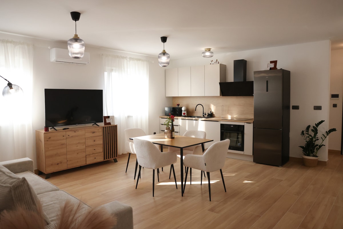 Welkom in onze nieuwe, zeer gezellige studio van 33 m² in een nieuw gebouw met een balkon, ontworpen voor 2 personen en met een tweepersoonsbed. Gratis: stabiele wifi, Android TV32", stadsverwarming, airconditioning, eigen parkeerplaats in de garage in het gebouw. Het appartement is gelegen in een nieuw dorp in de wijk Ferenščica, op slechts 4 km van het stadscentrum en op slechts 2 km van het centraal busstation. Konzum markt en Bipa drogisterij op 100 meter. De tramhalte ligt op vijf minuten lopen.