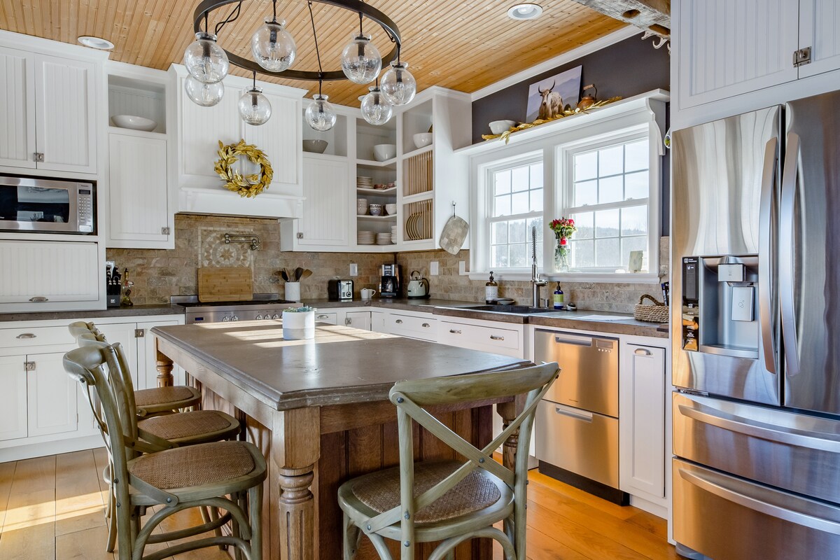 1 minuut van Warren St - zoutwaterzwembad en warme sauna respijt! Geen kosten bespaard gespaard van dit historische 18e-eeuwse landgoed van 80 hectare - verwarmd zwembad, cederhouten sauna, verwarmde badkamervloeren, originele houten afwerkingen, openslaande deuren onder glas-in-loodramen van het iconische Chelsea Hotel van NYC. Je hebt de perfecte combinatie van transcendentalistische oase met moderniteit gevonden die een zeer comfortabel verblijf biedt. Geniet van een duik, stoom, glooiende weiden, geitenbladeren, cocktail bij het vuur op je patio!