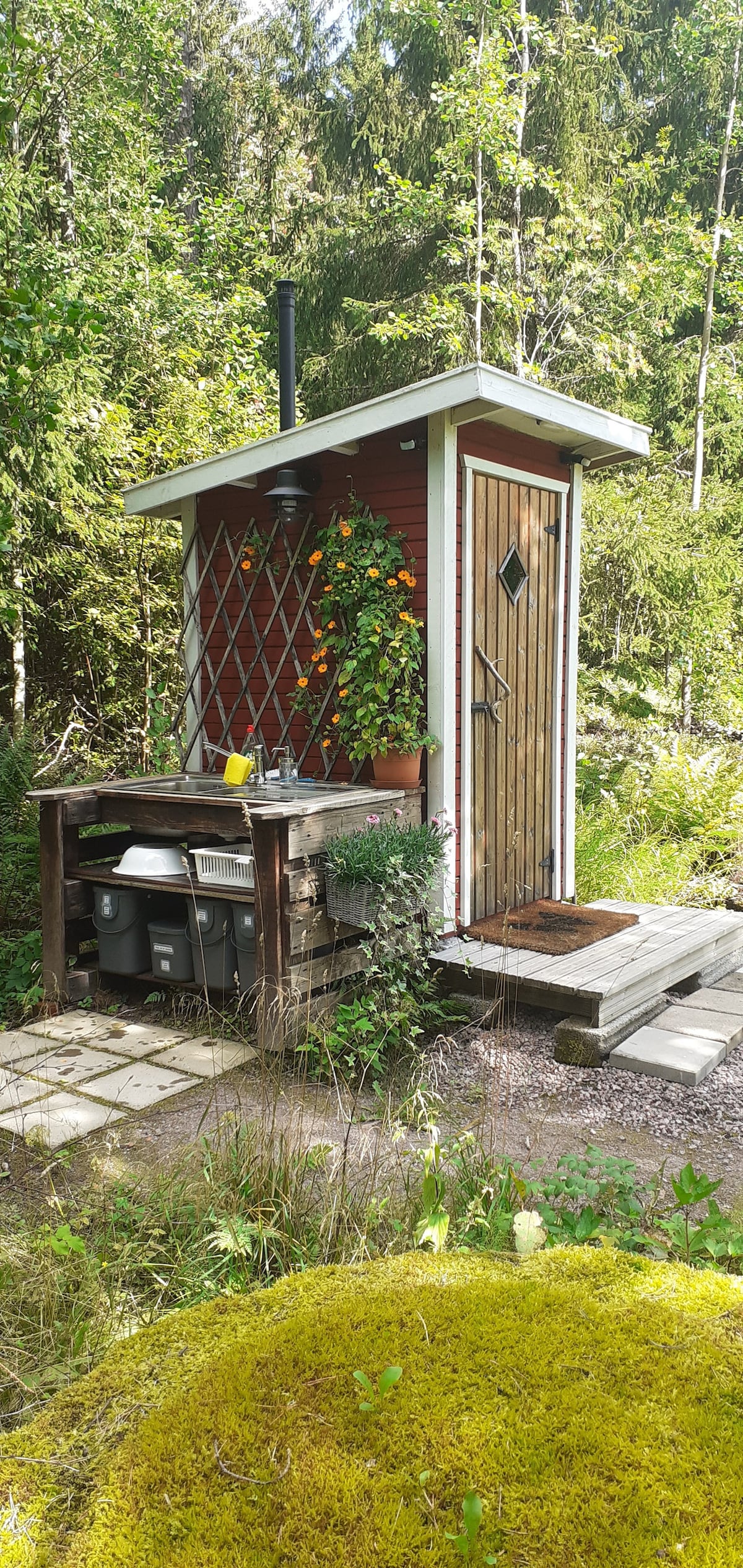 Het huisje is gelegen in Nationaal Park Nuuksio op een prachtige heuvel groeiende pijnbomen, aan de oever van een schoon water Ruuhilampi. Het is 11 km naar Vihti Gofken en Puuhaparkki. De blokhut werd gebouwd in de jaren vijftig van de vorige eeuw. De nieuwere kleinere blokhut werd gebouwd in 2012. Bij beide is nostalgisch. Een houtgestookte sauna, ontworpen door Reima Pietilä, ligt aan het strand in 1958.