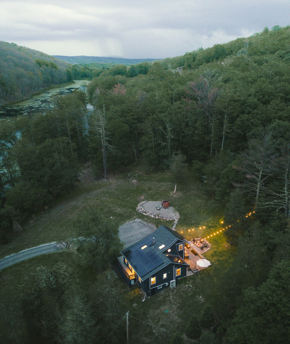 Moderne bungalow in Scandinavische stijl aan de rivier op 8 hectare. Ga op je terras zitten met twinkellichten voor koffie/diner gevuld met geluiden en uitzicht op een ruisende rivier; loop over de rivier naar je eigen zwemplek! Perfect voor een natuurretraite, wandelen, zwemmen, vissen (elk april gevuld), skiën, werken met uitzicht op de bergen of schrijf die je altijd al wilde afmaken. 2 uur van de George Washington Bridge. Oplaadpunt van niveau 2. Haat heeft hier geen huis - het is allemaal welkom.