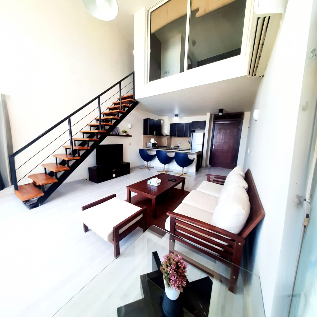 Egal, ob Sie die wunderschöne, luxuriöse Ferienanlage genießen möchten, Sport treiben, zu den Schnorchel- und Tauch Hot Spots fahren, den arabischen Flair der Städte erleben möchten oder online vor dieser Kulisse arbeiten, hier sind Sie richtig. Die zweistöckige Wohnung verfügt über ein 6 Meter hohes Panoramafenster. Die Sicht über die Anlage und das Meer ist atemberaubend. Amerikanische Küche, Wohnzimmer und großer Balkon im 1. Stock. Badezimmer und Schlafzimmer im 2. Stock.