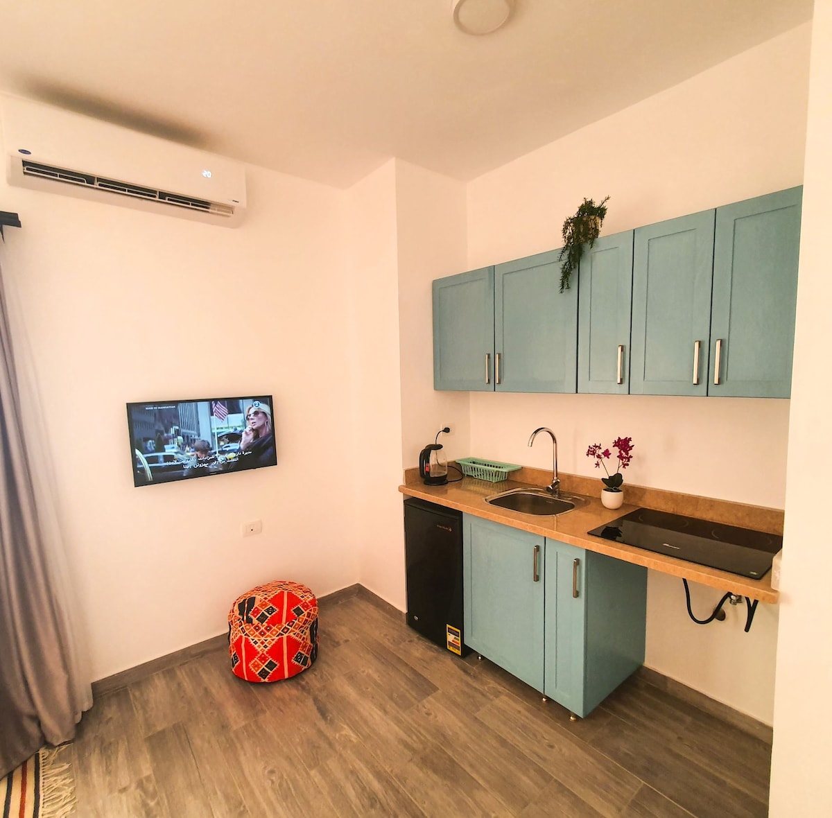 Studio-appartement gelegen in El Ahyaa Hurghada, op slechts 5 minuten van El Gouna en op 20 minuten van het centrum van Hurghada. Gemakkelijk bereikbaar met Uber/taxi. Het appartement is gelegen in een nieuw gebouwd resort, het Imperial Resort, met uitzicht op de betoverende Rode Zee en de eilanden. Het appartement is uitgerust met airco en alle benodigde voorzieningen voor een rustig verblijf. Het heeft een ruim balkon waar je kunt genieten van de zeebries. Je kunt zowel de zonsopgang boven de zee als de zonsondergang boven de bergen zien.