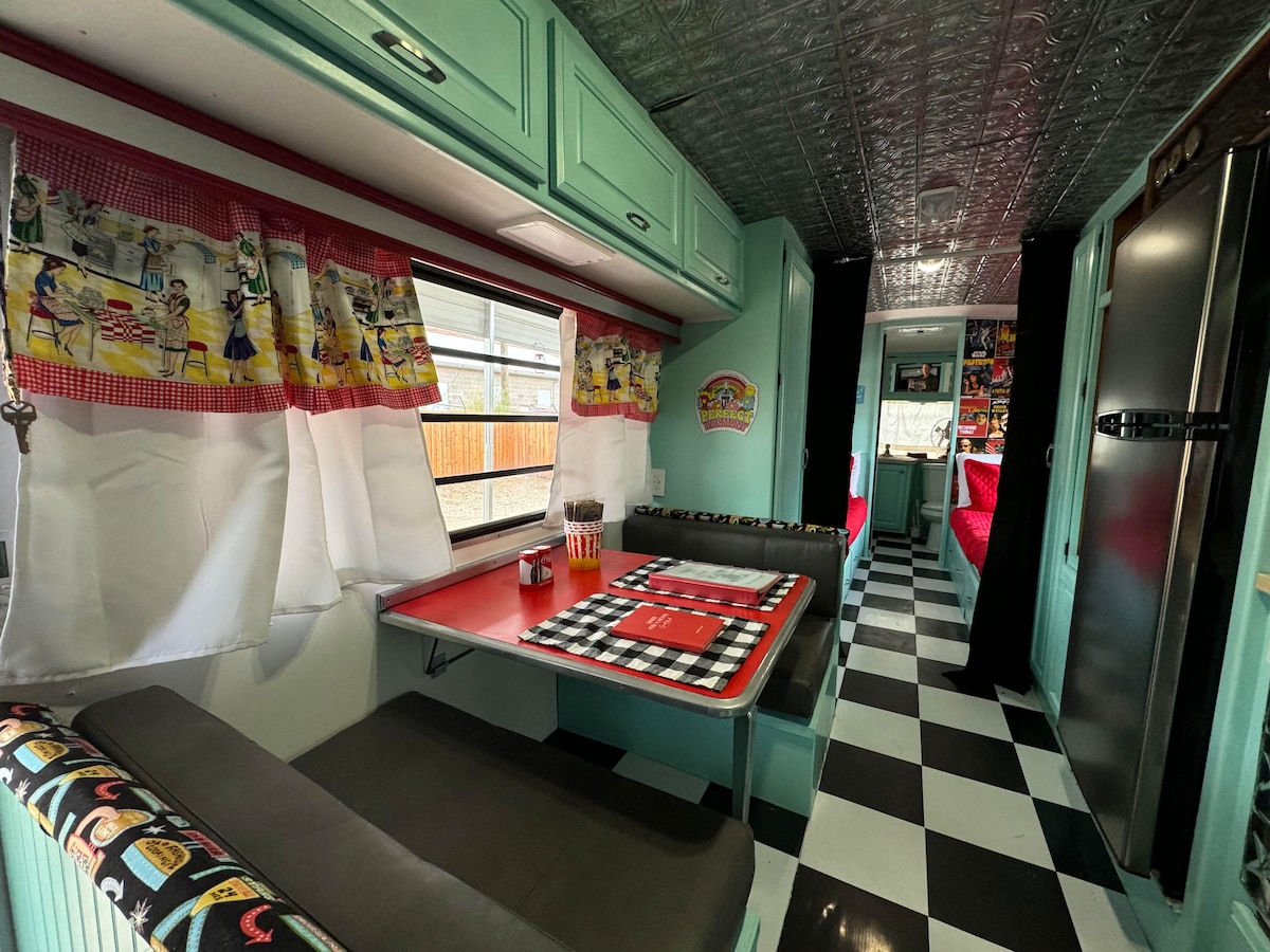 Looking for a stay with a little extra sizzle? Diner and a Movie is a fully-equipped vintage Avion trailer we’ve restored with a retro flair and modern comfort, taking you straight back to a classic 1950s diner-jukebox vibes, neon colors, and a cozy setup for watching your favorite flicks. Located just south of downtown Moab, our growing collection will eventually include five other trailers, each with its own unique theme. Come be part of something cool, classic, and unforgettable!