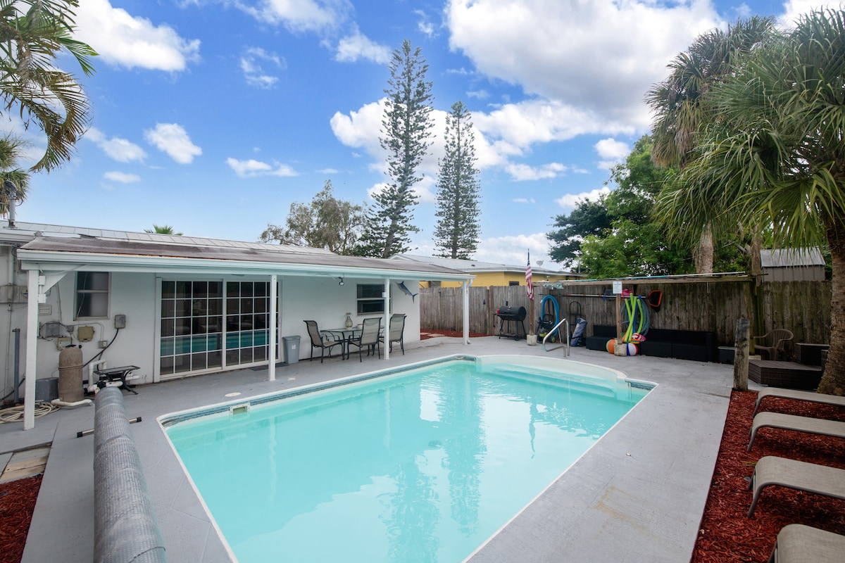 Ontspan in deze lichte en vlekkeloze 3BR met privézwembad, snelle wifi en volledig gevulde keuken. Perfect voor gezinnen, professionals en wintervluchtelingen die op zoek zijn naar comfort en gemak. Het Sunshine-huis is opzettelijk voor jou gerenoveerd. Een paar minuten van het centrum, minder dan 10 minuten rijden naar het strand en 15 minuten rijden naar het centrum van Stuart, op loopafstand van Indian River Side Park en Jensen Beach Boat Ramp. Het Sunshine-huis biedt alle voorzieningen die je nodig hebt om te genieten van een ontspannen, gemakkelijke strandvakantie.