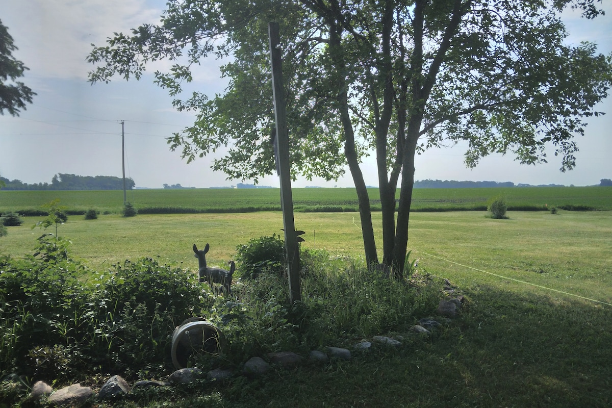 Deze schone, moderne ruimte heeft landelijke charme, rust en stilte en een prachtig landschap. Het ligt van de hoofdweg, maar dicht genoeg bij alles. 35 minuten ten westen van de luchthaven MSP. De ruimte is de hele benedenverdieping. Eigen ingang, verwarmde vloeren en ijskoude airco. Twee smart-tv's, een in de slaapkamer en de woonkamer. Goed gevulde kitchenette en mooie koelkast. Voldoende ruimte om te koken, tv te kijken, te werken of gewoon te rusten. Een mooie grill en kampvuurruimte zijn aanwezig. Huisdieren zijn van harte welkom.