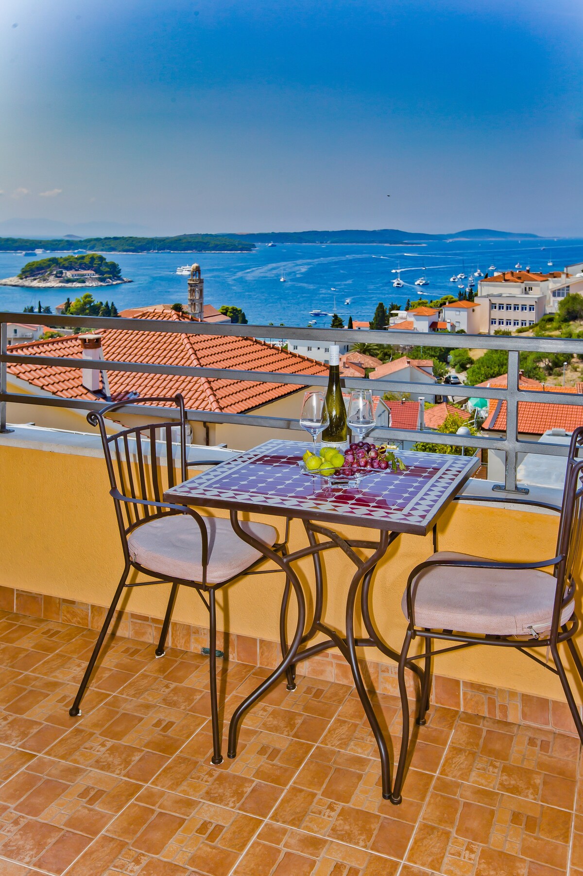 Van het geurige florale hekwerk bij de ingang tot een schattige slaapkamer, elk gastvrij detail van dit mooie appartement is met zorg overwogen. Geniet in het bubbelbad op het enorme balkon met uitzicht van 180 graden en geniet van het uitzicht over de stad Hvar en de Pakleni-eilanden.