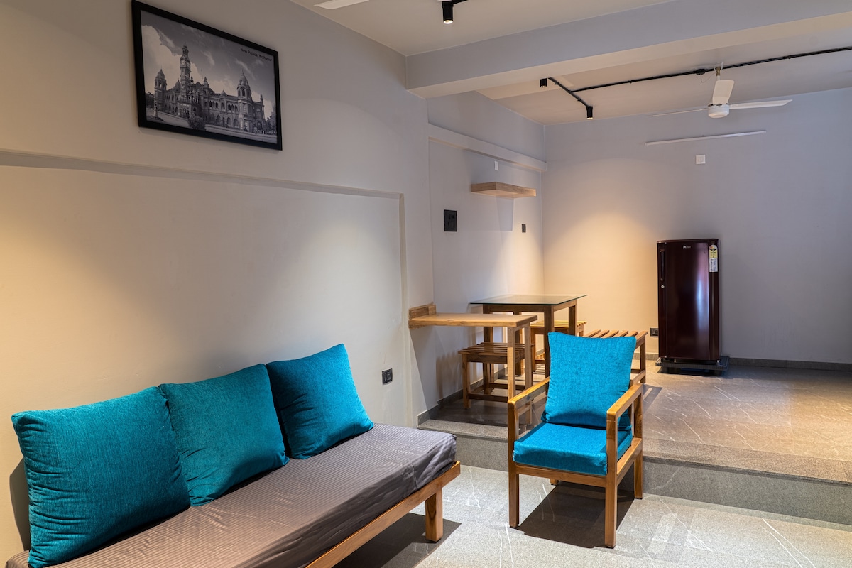 Drift into deep rest in a cozy bedroom that blends modern textures with soft lighting. Featuring a luxurious queen-sized bed with an upholstered headboard, a sleek full-length mirror, ambient pendant lights, and a serene circular wall niche, the space invites you to unplug and truly unwind. Whether you're reading under the warm glow of the pendant lights or waking up to a sunlit room, comfort meets aesthetics in every detail. The in-room AC and fan ensure a pleasant stay through all seasons.