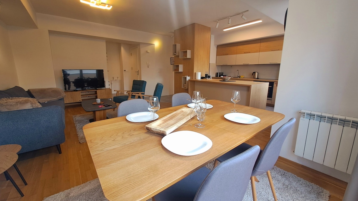 Geniet van een stijlvolle ervaring op deze centraal gelegen plek Dit is GLOEDNIEUW appartement van 60 m2 op 5 minuten lopen van het stadspark (stadion) en van het centrale plein. Best mogelijke locatie, zeer dicht bij de mooie straten van Debar Maalo met vele bars en restaurants. Het appartement is met 1 slaapkamer met queensize bed en een woonkamer met comfortabele slaapbank + uitschuifbed. Ook 2 balkons van beide kamers, een met uitzicht op de berg Vodno. Je kunt het gebruiken om koffie te drinken of te lunchen