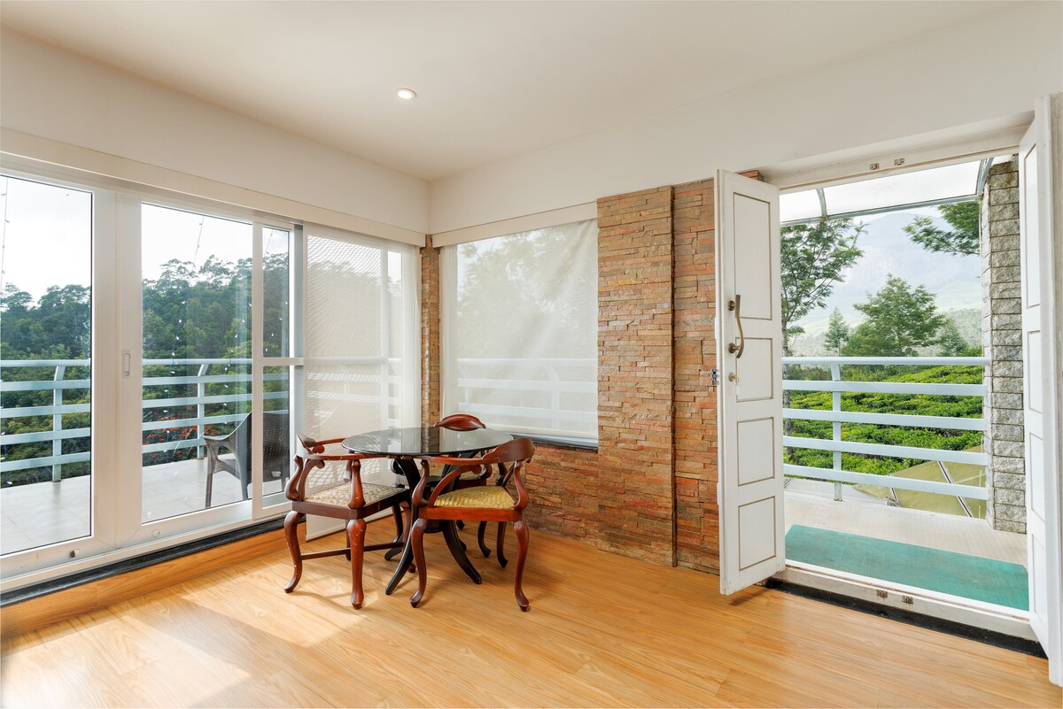 Blackberry Hills ligt op een mistige berghelling in Munnar en is een serene eco-retreat met een prachtig uitzicht op de vallei, zorgvuldig samengestelde ervaringen en warme gastvrijheid. Ruime villa ideaal voor gezinnen, met een gezellige slaapkamer, een woonkamer en een eigen balkon met prachtig uitzicht op de vallei, en een warm interieur dat comfort combineert met de natuur. Genesteld in een sereen eco-resort, kun je genieten van gemakkelijke toegang tot natuurpaden, theeproeverijen en meer. Perfect om weer in contact te komen met dierbaren in het hart van Munnar.