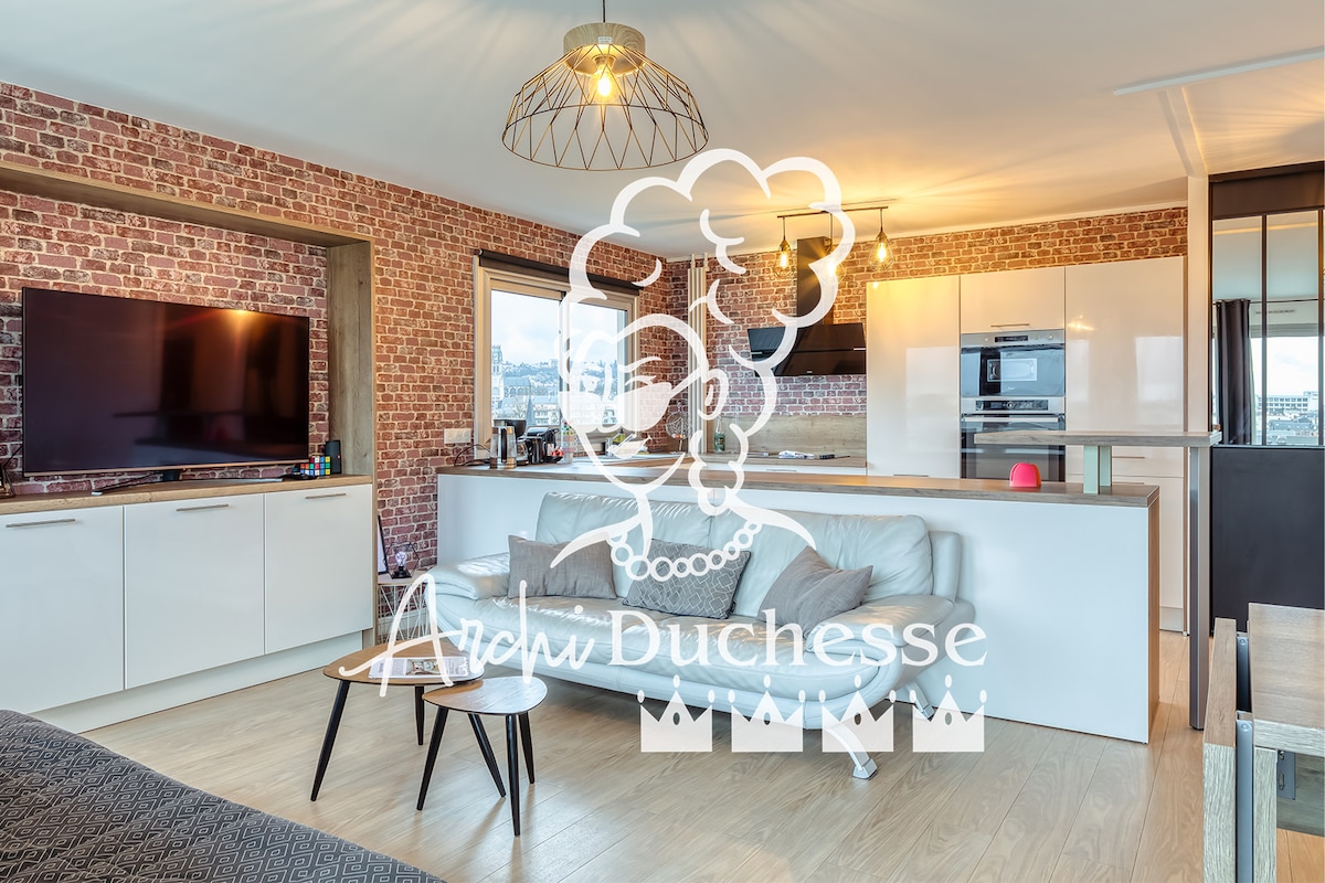 Dit appartement zal je onderdompelen in een chique kasteelomgeving, met een vleugje moderniteit, vanaf je hemelbed heb je een prachtig uitzicht op de Abbatiale Saint-Ouen. Een parkeertempo wacht op je op minder dan 300 meter lopen op een parkeerplaats. Badkamer met douche waar je kunt ontspannen terwijl je muziek maakt. Het appartement ligt in het hypercentrum, via een doodlopende straat op 50 m afstand vind je je aan de Rue du Robec met al deze restaurants van verschillende sfeer.