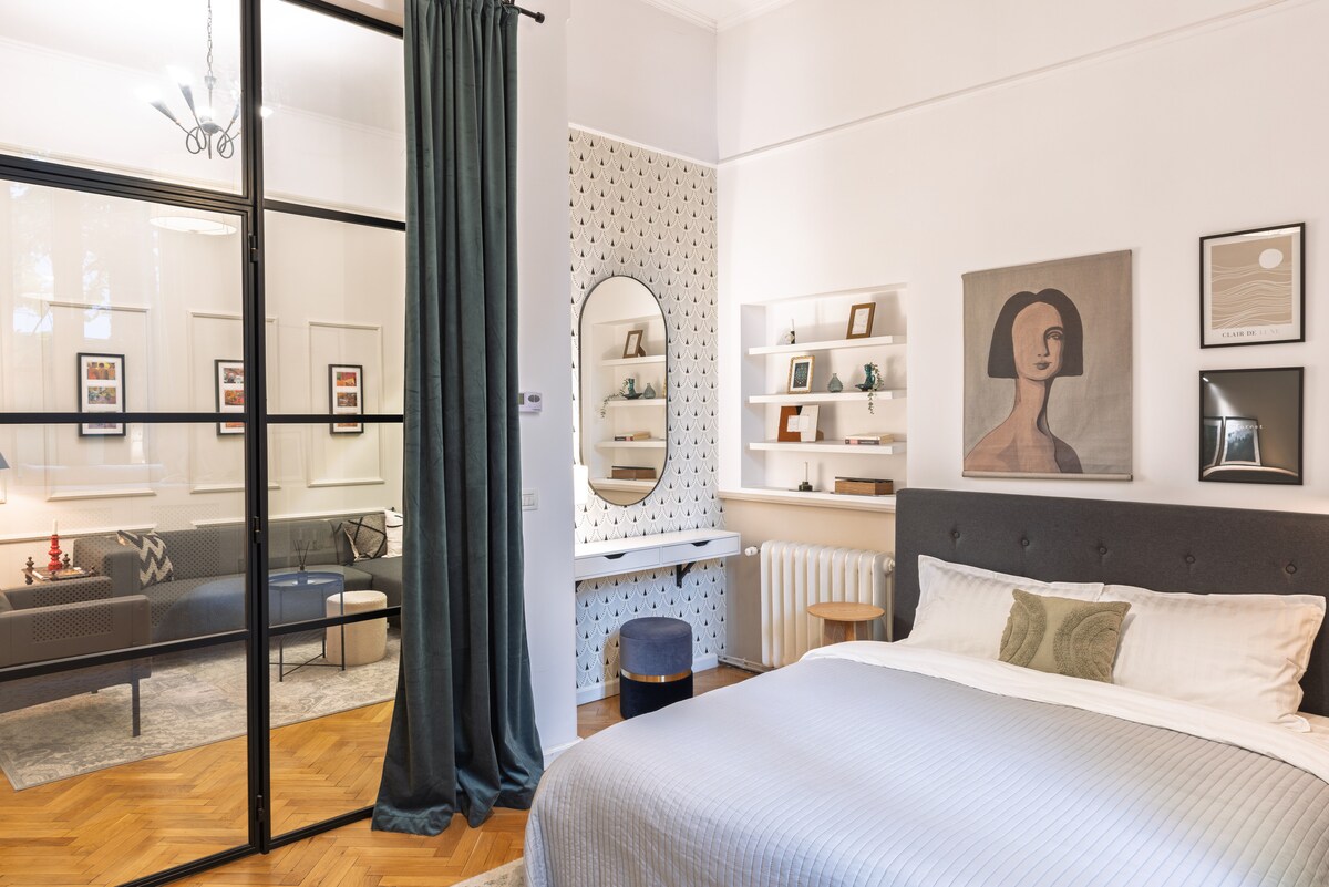 Een van mijn beste persoonlijke projecten! Dit mooie appartement met één slaapkamer ligt aan een van de belangrijkste boulevards in het hart van Boekarest - Calea Victoriei. Het draagt veel historie, die ik wilde houden en doen herleven. Zoals ik in al mijn appartementen doe, heb ik de prachtige houten vloer behouden, die werd neergelegd met behulp van een techniek die niet meer wordt gebruikt en nog een element dat ik je heb laten ontdekken. Dat zal je iets vertellen over de vrouwen die er woonden. Al het andere is volledig veranderd.