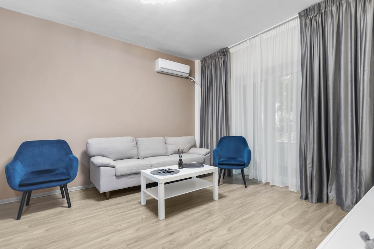 Mido Parliament Apartment offers cozy one-bedroom with large windows that provide stunning views of lush green surroundings in a complex finished in 2024. Guests can enjoy the convenience of free private parking and self-check-in. Ideally located in Central Bucharest, at just 200m from Unirii Fountains, 300m from the Palace of Parliament, and 600 to the Downtown. It offers quick access to top attractions, restaurants, and transport, all while staying in a modern, comfortable space.