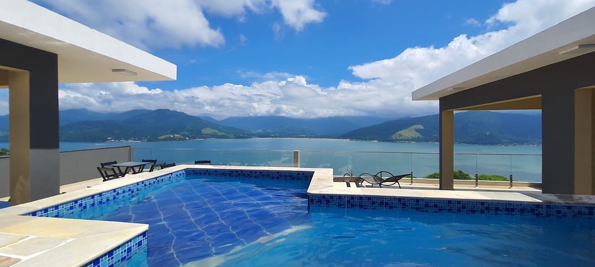 Chalet met 2 verdiepingen en een uitkijkpunt met uitzicht op zee, omgeven door het Atlantische Woud. Er zijn 2 slaapkamers, kantoor, bovendek met toegang tot het prieel, uitgeruste keuken, tv-kamer met Netflix, badkamer, volledig omheinde achtertuin, douche, barbecue en tuin met fruitbomen. We hebben wifi in de hele accommodatie. We liggen op slechts 10 minuten van de pier en op 7 minuten van de winkels van Vila do Abraão. Hier is het niet alleen accommodatie, maar een ervaring van onderdompeling in de natuur :