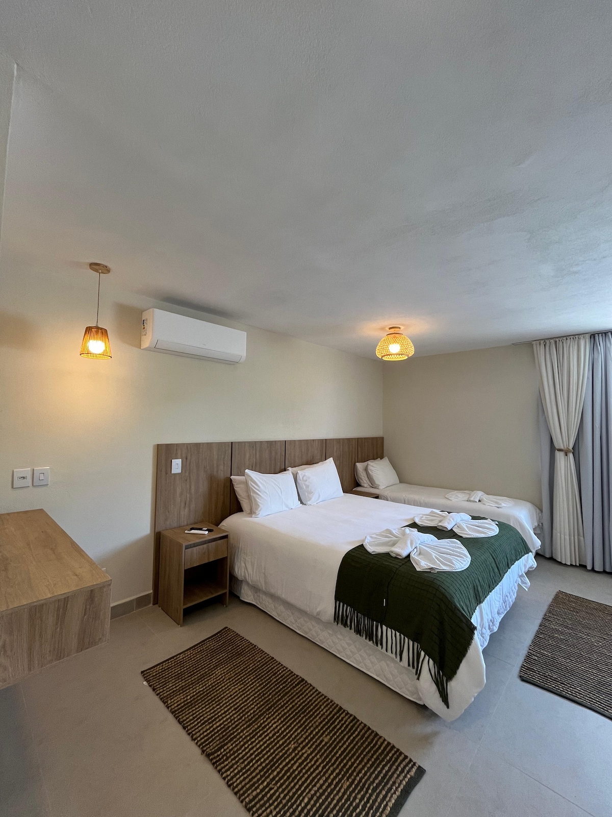 Privésuite 16 m² geschikt voor 4 personen met 1 tweepersoonsbed en 1 stapelbed, minibar, airconditioning, kookplaat, gootsteen, basis keukengerei, digitale antenne-tv, parkeren voor de suite met individuele poort. OPMERKING: we bieden geen beddengoed, bad, ontbijt. Alleen hoeslakens voor elk bed en kussens met kussenslopen. We accepteren kleine huisdieren onder de hoede van de voogd, het is noodzakelijk om het binnen de suite te houden, want buiten is er geen scheidingswand waar de auto's zijn.