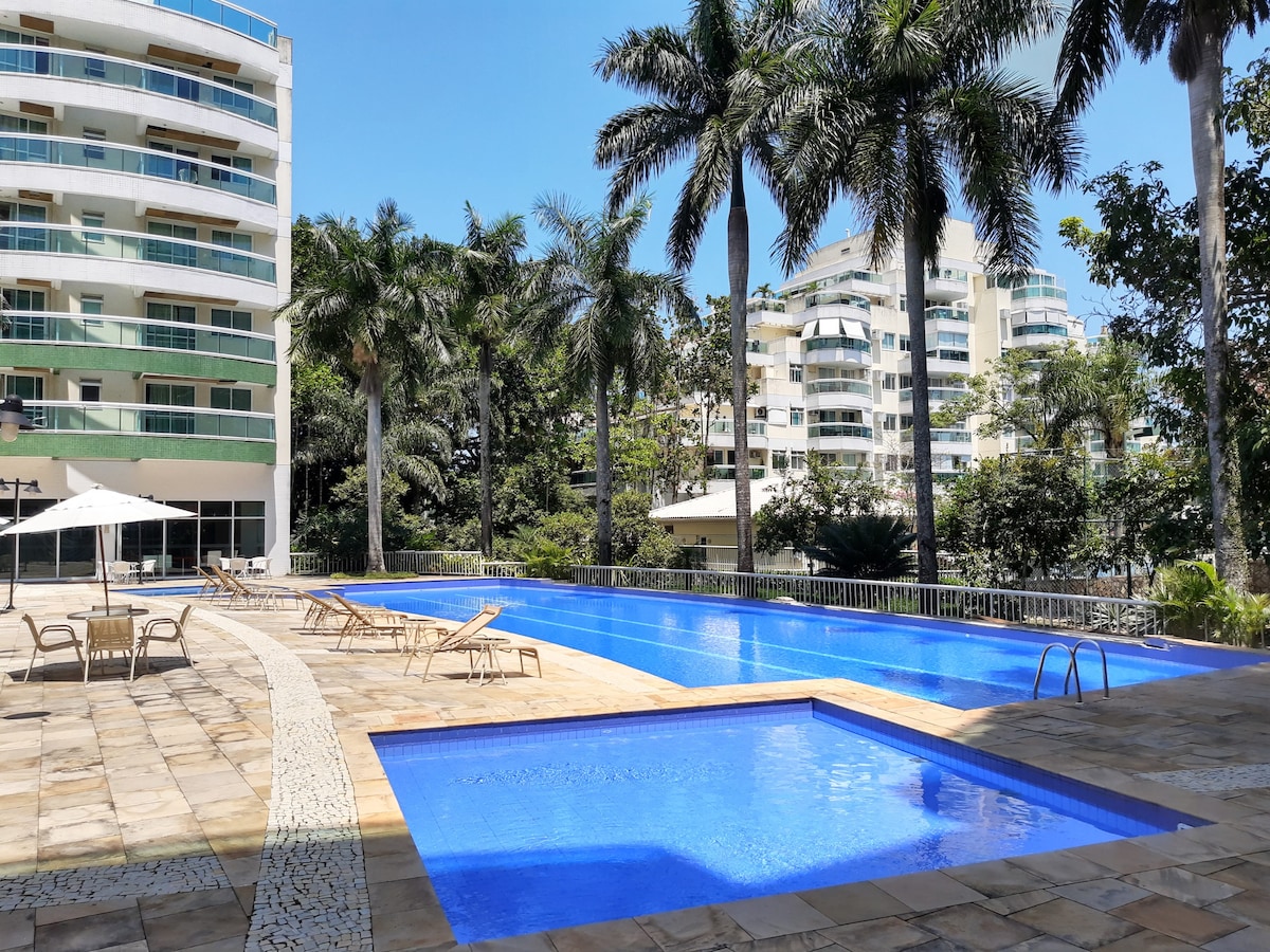 Lindo flat térreo (NÃO FUMANTE) na ilha de lagoa Gigóia, um dos lugares mais pitorescos do Rio Uma bolha de paz e tranquilidade no coração do bairro mais moderno do Rio, perto da praia, metrô, bares, restaurantes e 5 grandes shoppings Acorde com o canto dos pássaros.Passeie em segurança pela ilha sem carros.Vá de barco até a praia À beira da água. Vista para a água e montanhas. Aproveite a vida urbana/noturna da região Barco (pago) 24h todos os dias do ano Estacionamento pago perto