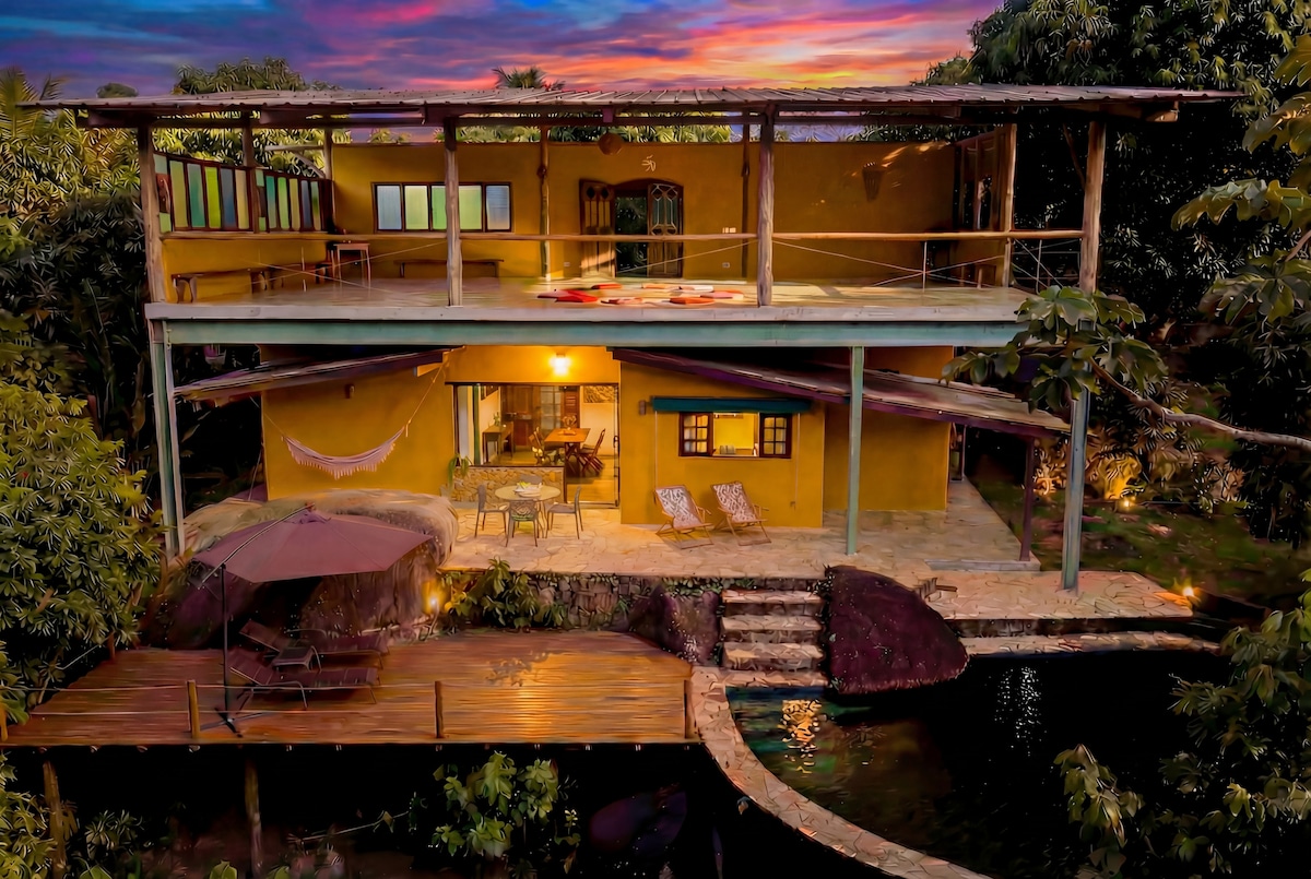 Huis van 120 m² midden in de natuur van het oude waterpark Ilhabela, met 2 gezellige suites met 43 inch smart-tv en warme/koude lucht. Charmante kamer met 65 inch smart-tv en warm/koud lucht. Volledige keuken met grote 430L Panasonic koelkast, 1000 Mbps glasvezel wifi en eigen achtertuin met barbecue en eigen natuurlijk zwembad. Boven, een kingsize bed suite met uitzicht op de sterren, bad en balkon. Groot balkon met pooltafel, hangmat en brug naar het prieel met waterval.