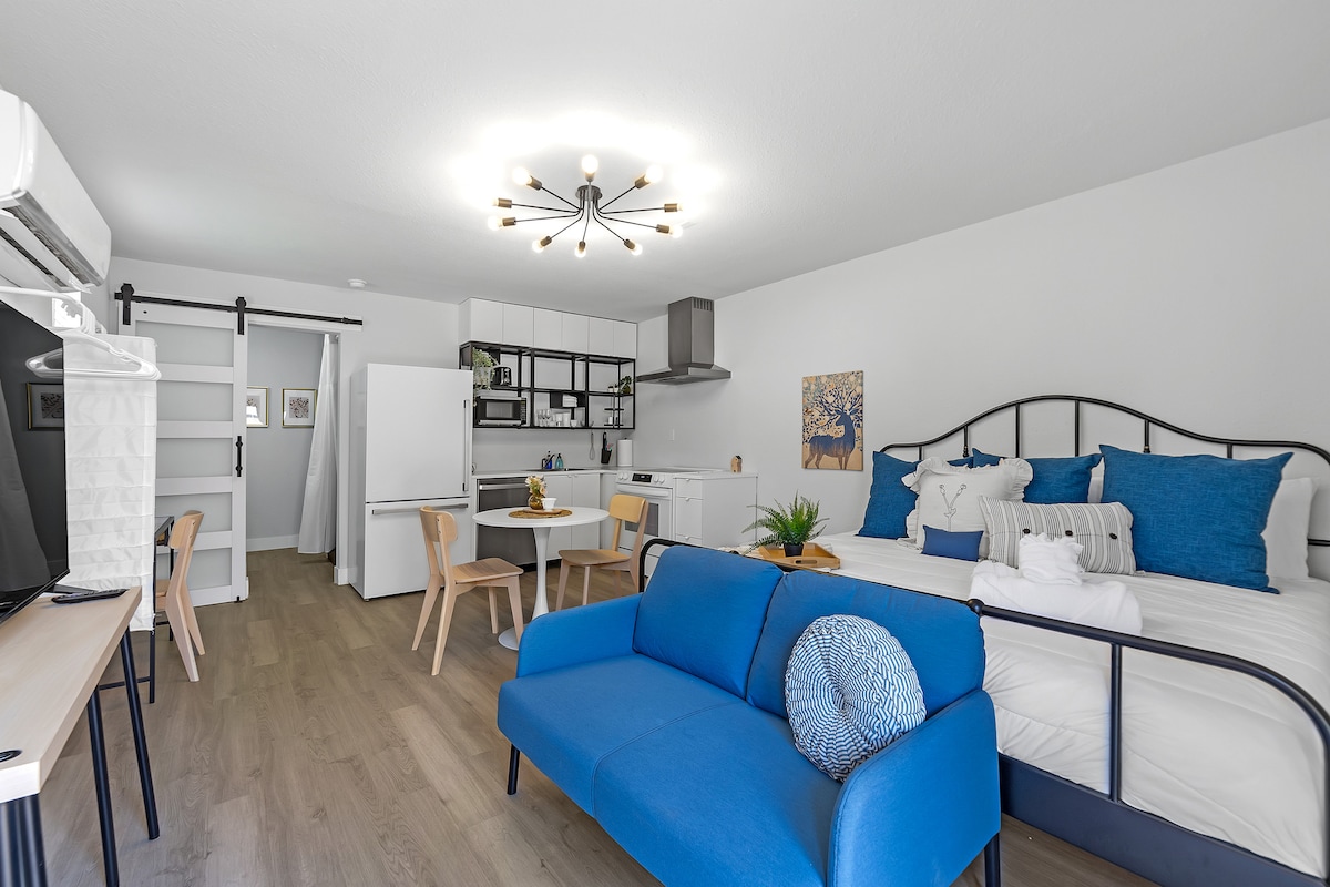 Deze chique ruime open studio is de perfecte ruimte voor twee personen die wachten op een privé-uitje met uitzicht op het meer. Een heerlijk queensize bed, een jacuzzi, een open haard, een airconditioning, een kitchenette en een volledig strakke badkamer liggen binnen handbereik. Volledig ingericht van boven tot beneden zorgt voor weinig inpakken. Een volledige muur van glas vangt het hele meer vanaf de top van de bergkam. Gril op de afgelegen patio en ervaar je eigen unieke zonsondergang. Ga bij het kampvuur zitten om de verbinding te verbreken.