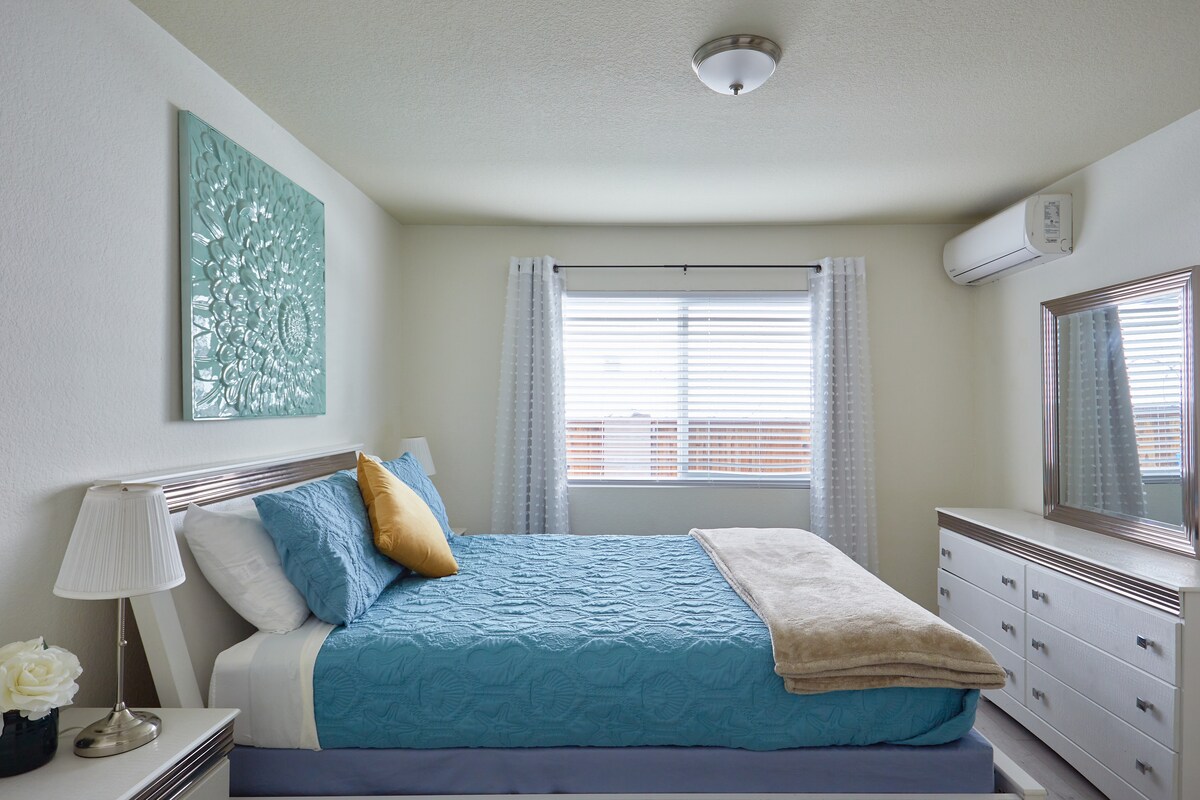 Dit is een achterhuis met één slaapkamer, volledig privé, kleine kitchenette, koelkast, badkamer heeft een luxe dubbele wastafel met jacuzzi, slaapkamer heeft een kingsize bed met comfortabel matras, queensize luchtmatras, 70inch tv met wereldwijde zenderapp betaald, snelle wifi, koffiezetapparaat en gratis koffie in de koelkast, heeft net een zeer rustige mini split airconditioners geïnstalleerd die ook worden gebruikt voor verwarming, zeker bereid om samen te werken met jou om iets toe te voegen of te verwijderen op je gemak
