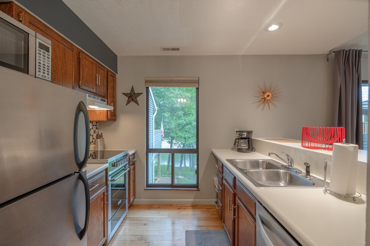 Ontdek sereniteit in Shadow Lake Cottage - een rustig chalet aan het water met een eigen aanlegsteiger, een kingsize suite en een kamer met drie seizoenen, omgeven door volwassen eiken- en kornoelbomen. Of je nu weer in contact wilt komen met geliefden, je wilt terugtrekken met vrienden of een tijdje aan het kantoor wilt ontsnappen, dit charmante vakantiehuis in de buurt van St. Louis in Innsbrook Resort biedt een perfecte mix van comfort, privacy en resortvoordelen.