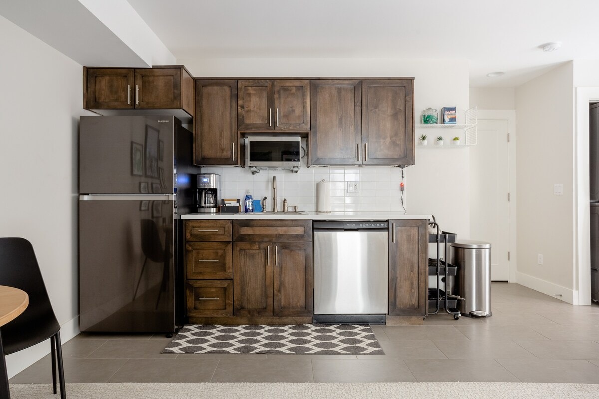 Geniet van privétoegang tot een slaapkamer en woonkamer smaakvol ingericht met: Een zeer comfortabele slaapbank; Gloednieuwe badkamer met douche en verwarmd handdoekenrek. Een wasmachine en droger aan de voorkant; Borden, koelkast, wastafel, koffiezetapparaat, magnetron, magnetron, voldoende aanrechtruimte en een kleine eettafel; Privé-wifi-netwerk. We hebben veel liefde gestoken in het mooi en comfortabel maken van deze plek. Bekijk onze vijfsterrenrecensies! Laat inchecken kan eenvoudig worden ondergebracht met een deurslot met toegangscode. We willen graag dat je van onze studio je thuisbasis maakt. Neem de familie mee. Je comfortabele slaapbank is nog twee slaapplaatsen. Wil je een lichte snack tussen restaurants? Loop een paar blokken naar onze lokale New Seasons supermarkt. Gebruik je kitchenette met koelkast, magnetron, koffiezetapparaat, borden en houten aanrechtbladen. Laad je reiskleding op met de Europese wasmachine/droger aan de voorkant. Pak licht in. Haardroger, strijkplank, handdoeken voor de douche... zelfs paraplu 's zijn allemaal dichtbij. Met een eigen ingang, parkeergelegenheid op straat en een digitaal slot is de ruimte van jou voor je bezoek. We genieten van onze achtertuin, vooral in de zomer, en je bent van harte welkom om mee te doen aan het plezier. We delen graag onze favoriete restaurants, parken en wandelingen als je op zoek bent naar suggesties. Deze gewilde wijk is de thuisbasis van tientallen restaurants en bierbars op loopafstand, terwijl er een Bike Town fietsdeelstation is een straat verderop om de stad te verkennen. De lokale New Seasons supermarkt ligt op een paar blokken afstand. Parkeerplaats Bike Town fietsdeelstation een straat verderop Everybody 's Bike Rental op een halve mijl afstand Uber, Lyft en taxi 's altijd binnen enkele minuten GetAround, Car2Go, Reach nu en Zip Car Bushaltes TriMet in de buurt Moderne architectuur en design maken het gemakkelijk om je geest leeg te maken en te genieten van de Portland-ervaring. Groen design omvat een open transom tussen slaapkamer en woonkamer.
