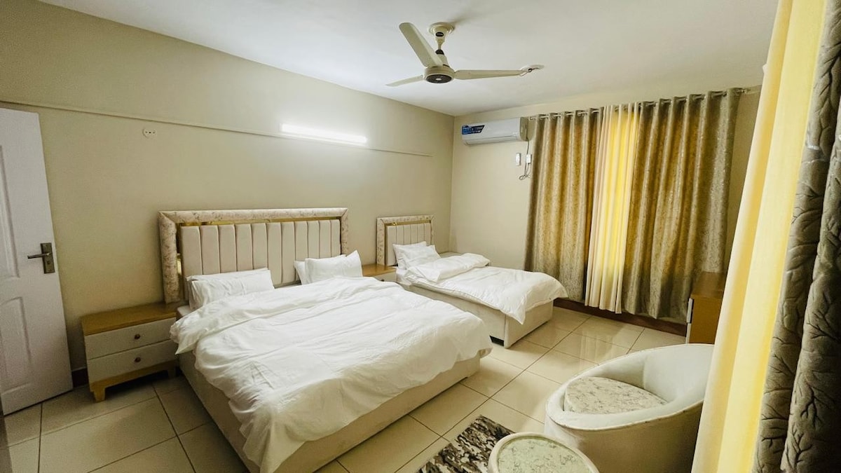 Designer 1BHK Condo | Giga Facing Balcony I Rooftop Infinity Pool ✨ Kingsize bed en eigen gigantisch balkon 📺 55 inch smart-tv en ultrasnelle wifi (30 Mbps) 🍳 Volledig uitgeruste keuken ❄️ Omvormer AC 's en warm water 🔒 Slimme sloten en moderne inrichting 🏙️ Boven Zeta Mall Food Court, op een steenworp afstand van Giga Mall 🌄 Schilderachtig uitzicht op de heuvels Perfect voor gezinnen en zakenreizigers. CNIC vereist (18+). Niet roken/feesten. Boek nu voor comfort en stijl!