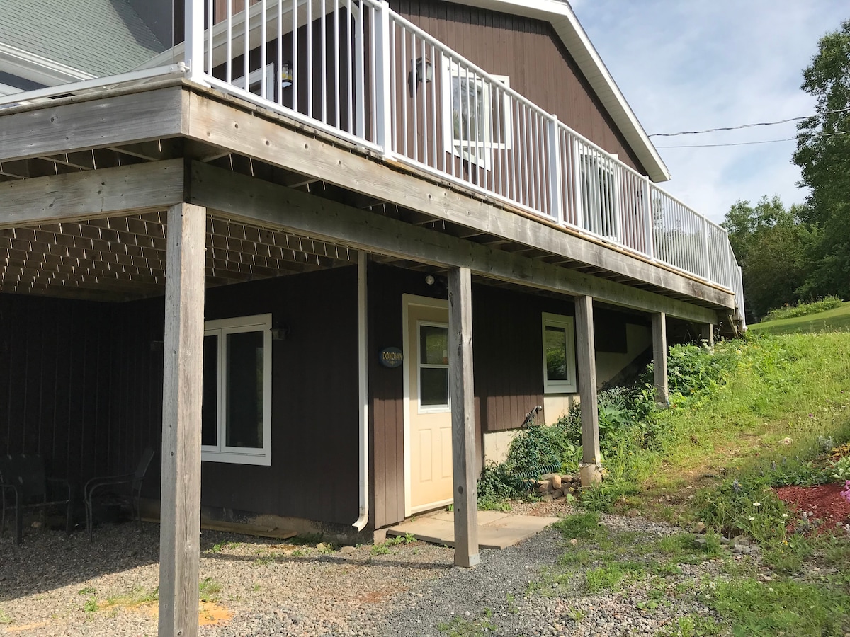 Geniet van een panoramisch uitzicht op het meer van Bras d 'Or vanuit deze zelfstandige suite met 3 slaapkamers op het uitloopniveau van ons droomhuis op een terrein van 30 hectare. Dit grote appartement bevindt zich op de eerste verdieping en heeft aparte ingangen en oprit. De inrichting van de suite is rustiek knoestig grenen en biedt een warme keuken, eetkamer en woonkamer. Een wasmachine/-droger, maak het complete bad en de inloopdouche compleet. Gelegen op slechts enkele minuten van The Lakes Golf Course en Ski Ben Eion en ongeveer 20 - 25 minuten. naar Sydney