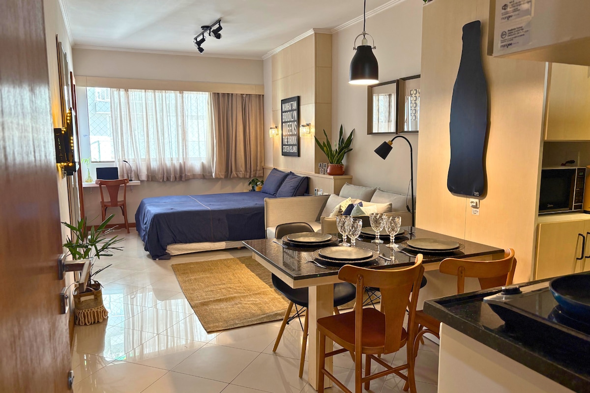 Het Mangoo Costa Sul Beach Hotel ligt op slechts 2 blokken van de ma. Een praktische ruimte, 24 m², met alles: inductiekookplaat, airfryer, led-tv, elektrisch koffiezetapparaat, gasverwarming, raambeschermingsnet en wifi. Het heeft ook alle voorzieningen van een hotel: 2 zwembaden, jacuzzi's, kinderbad, droge en stoomsauna's en parkeerservice (auto lift). Als het voertuig groot is, heeft het parkeergelegenheid voor de deur (apart betaald)