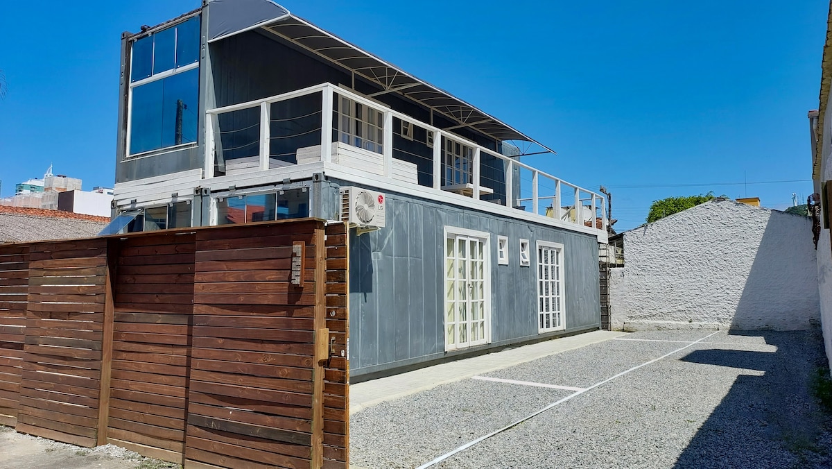 Kitnet voor 2 personen gemaakt in een gekoelde container (met THERMISCHE ISOLATIE zoals een gemeenschappelijk huis) + airconditioning BEGANE GROND ACHTERIN Met parkeerplaats en 120mb Wi-Fi internet Ideaal voor diegenen die het meeste uit de stad willen halen en geld willen besparen op hun verblijf Er zijn 1000m van het centrale strand. Rustige straat met nabijgelegen winkels en gemakkelijke toegang tot de belangrijkste lanen en Praia Brava. **elke witte deur op de foto 's komt overeen met een kitnet. Er zijn er zes in totaal.