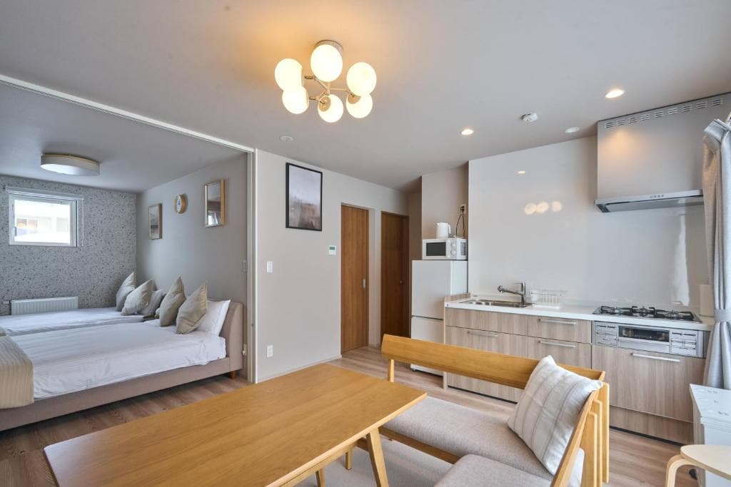 Newly built 2-bedroom apartment in central Kutchan, a 7-minute walk from JR Kutchan Station. HANAZONO Resort is a 10-minute drive and Grand Hirafu about 13 minutes away. Ideal for 3–4 friends, couples, or families visiting Niseko. The apartment features a spacious living room, equipped kitchen, ski storage, and fast Wi-Fi for relaxing after a day on the slopes. Restaurants, cafés, and a large supermarket are within walking distance. Enjoy local food and experience Niseko like a local.