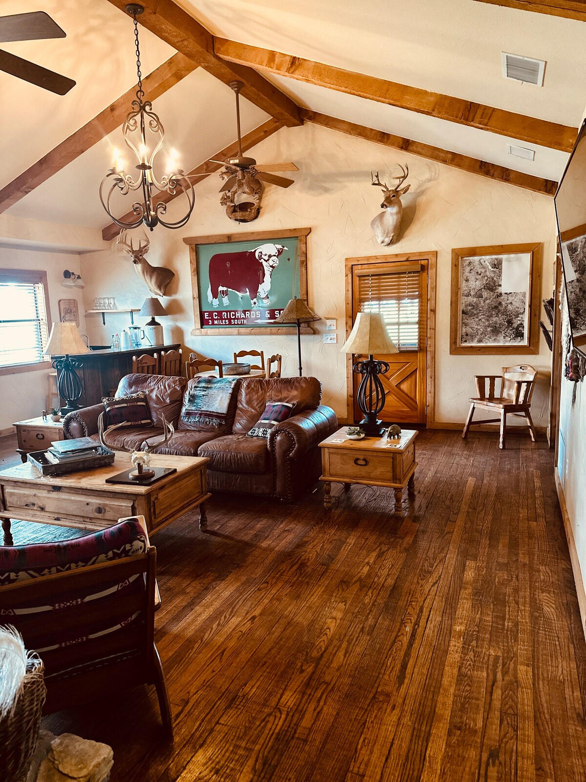 Welkom bij de Richards Ranch, Ranch House. Gelegen in de poort naar het westen 1,5 uur van DFW. Bekijk een perfecte zonsondergang in Texas op de veranda met uitzicht op honderden hectaren ranch. Deze rustieke hoeve heeft alle comfort van thuis en de sereniteit van het plattelandsleven. Kom je zorgen weg op een 135 jaar oude Texas Ranch.
