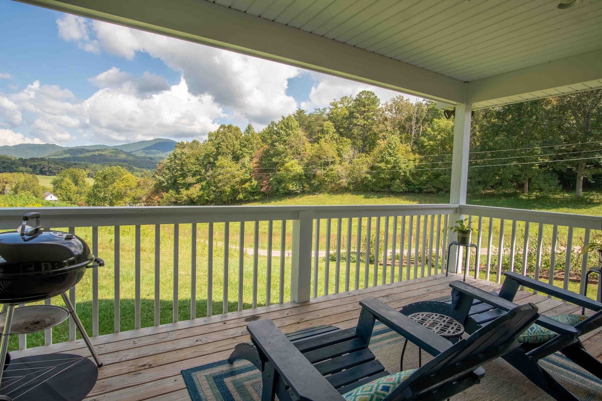 A newly renovated cabin that is minutes from Franklin and easy to reach, the real showstopper here is the gorgeous, year-round mountain view! Have dinner on the covered deck, cozy up around the fire pit, or just relax in the living room as you look out on the stunning landscape. The cabin is clean and tidy with fun, fresh decor. Central heat/AC, a gas fireplace, gas stove, gas grill, covered deck, YouTube tv, cornhole and outdoor firepit are among the amenities.