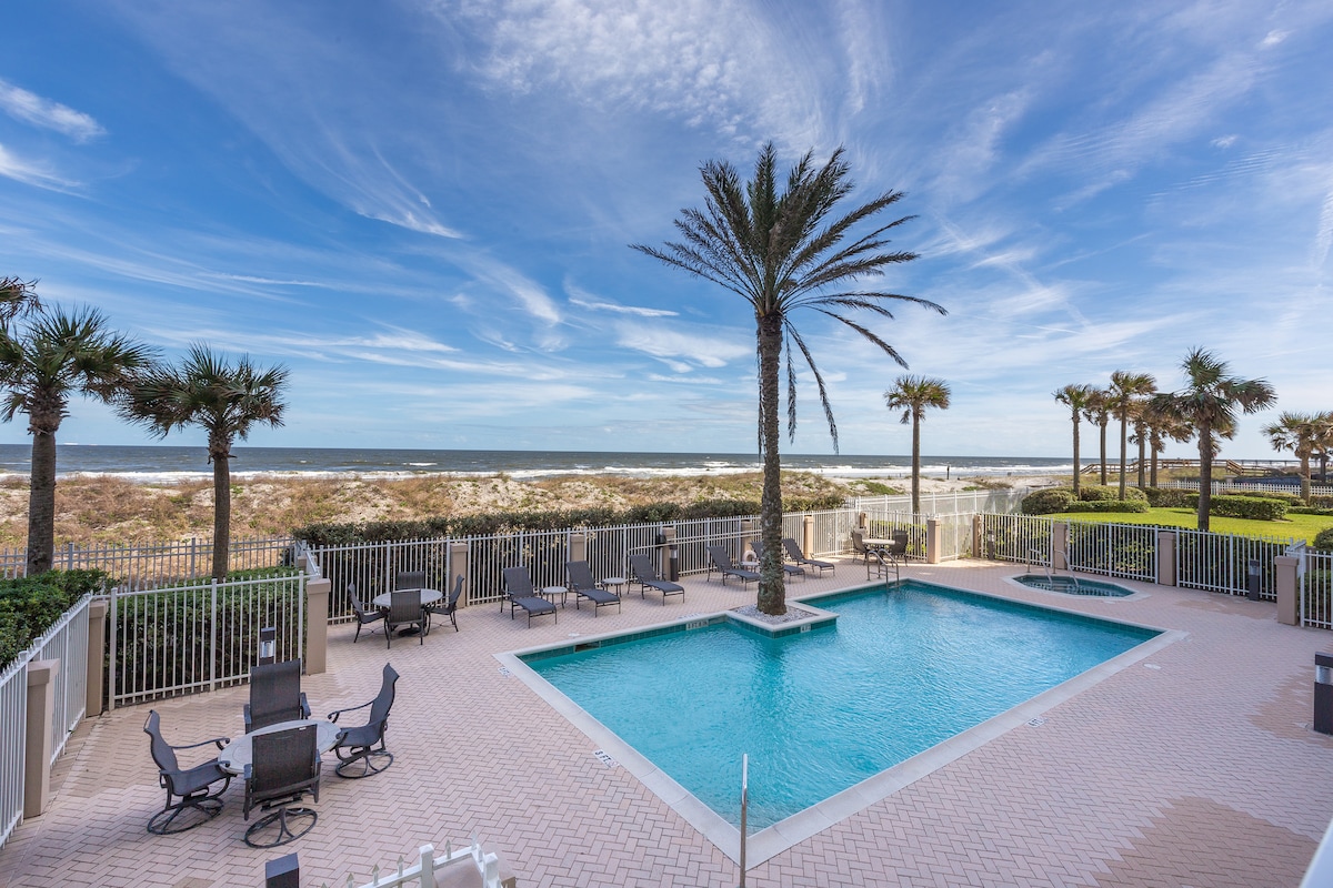 Appartement aan het strand met 2 slaapkamers, 2 badkamers, in North Jacksonville Beach met zwembad en bubbelbad. Enorm balkon met uitzicht op de Atlantische Oceaan. Omheind appartement...Geweldige locatie om de nabijgelegen Mayo Clinic, TIAA Bank Field (NFL Jacksonville Jaguars & College Football Games), Sawgrass Country Club (TPC), Daily 's Place (concertlocatie)..Dichtbij restaurants en winkels...Gymzaal (dezelfde verdieping als appartement)... Veel plezier, prive-ontsnapping voor vakantiegangers...Kwaliteit, schoon appartement aan de oceaan voor professionals in Jax voor zaken
