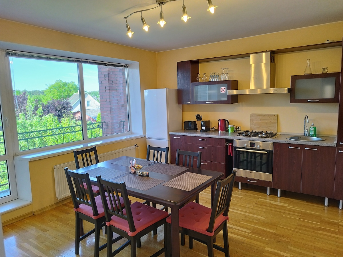 Spacious (80 sq.m.) and unique apartment with a ~35 sq.m. terrace, offering a panoramic view of the city of Kaunas. You will reside on the top floor, with no neighbors around. The apartment is located next to Kalniečiai Park. Also there is good access to Kaunas Airport. On the rooftop terrace, you will find a barbecue area and outdoor furniture. Inside the apartment itself: a fireplace, a large corner bathtub, a double bed, a stripper pole, a television and a fully equipped kitchen.